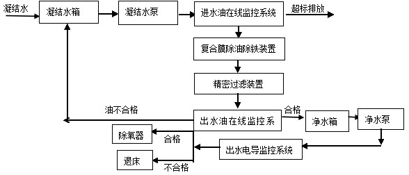 工藝流程:控制外來(lái)凝結(jié)水進(jìn)入凝結(jié)水箱,有凝結(jié)水泵經(jīng)過(guò)除油除鐵、過(guò)濾系統(tǒng),對(duì)合格的水進(jìn)入凈水箱,由凈水泵打入工藝系統(tǒng)管網(wǎng)中,對(duì)于不合格的再循環(huán)回收。