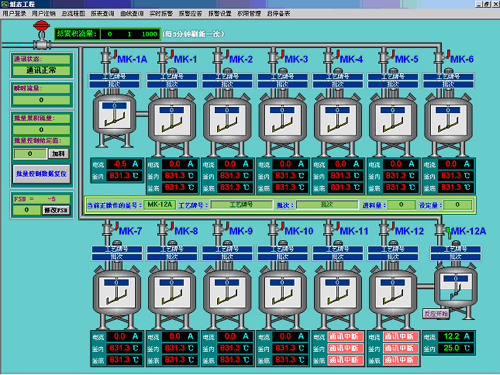 整個系統(tǒng)主要由一臺AI-708H控制14個反應釜的批量進料,分別由7臺AI-704M和7臺AI-501精確測量反應釜的溫度和電機的電流,所有這些都在主控PC上進行控制和顯示,并由軟件記錄并保存數據。