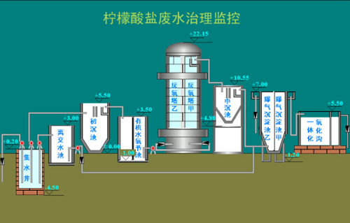 宜興協(xié)聯(lián)檸檬酸廢水處理廠采用厭氧加好氧處理工藝,其中好氧部分采用SBR法處理。SBR是處理高濃度有機(jī)廢水的理想途徑之一。一期設(shè)計(jì)日處理100立方/小時(shí),設(shè)2座爆氣池2座厭氧塔,氧化溝,有機(jī)調(diào)節(jié)池等12座處理池??刂圃O(shè)備布置分散,要求實(shí)現(xiàn)總線型遠(yuǎn)程檢測(cè)控制。